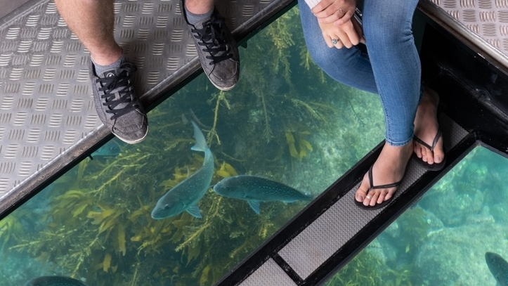 Look through the glass panels to view the school of snapper and other marine life in Gemstone Bay. Gemstone Bay is the home to the snorkel trail in the marine reserve. Since 1992 this area has been protected and now is full of snapper and other marine species. The fish will swim right past the glass and is fantastic to watch. This is one of our popular snorkel spots where you can hop in for a snorkel and be surrounded by fish. Keep your eyes out for crayfish hiding under the rocks and snorkelers swimming under the boat.